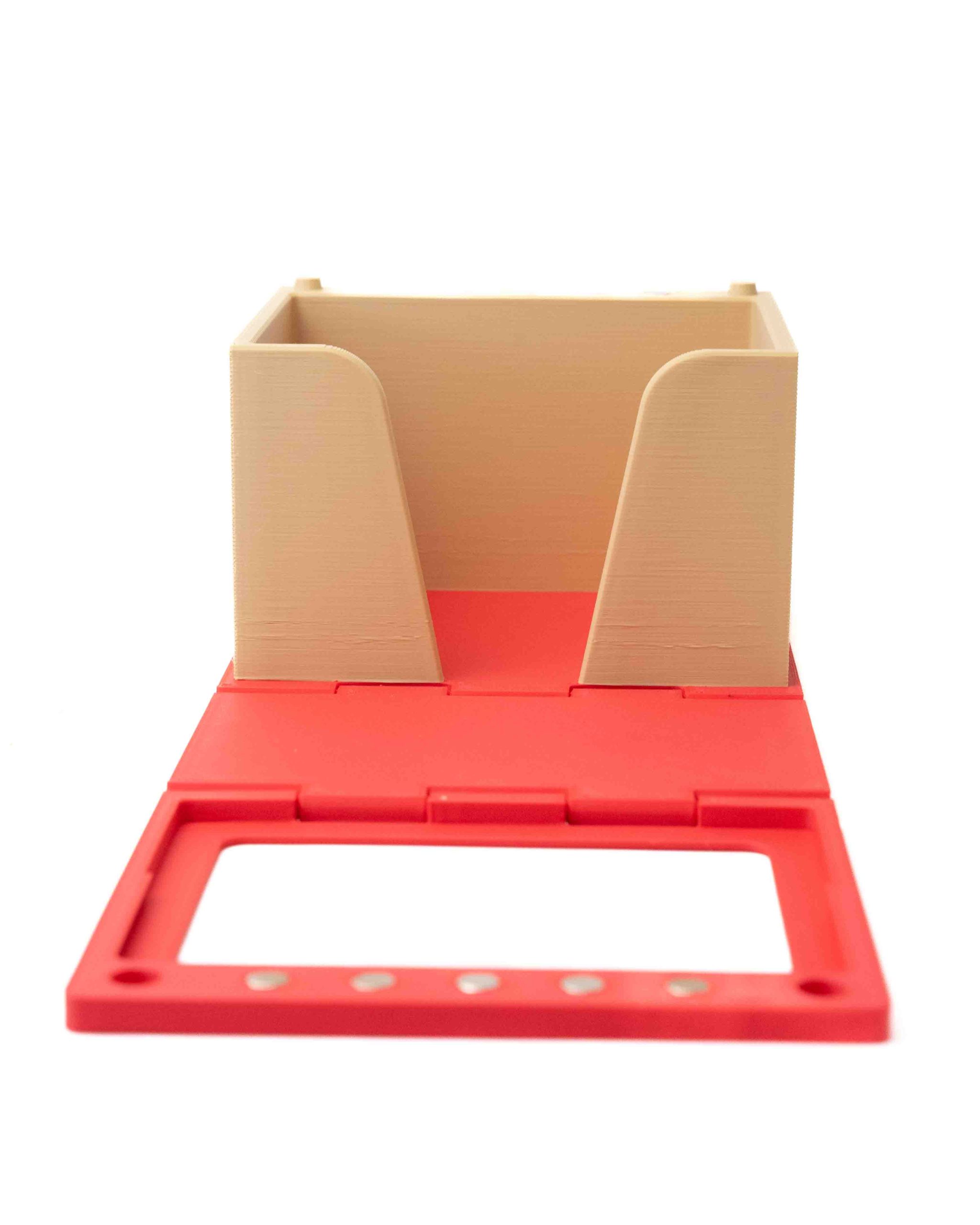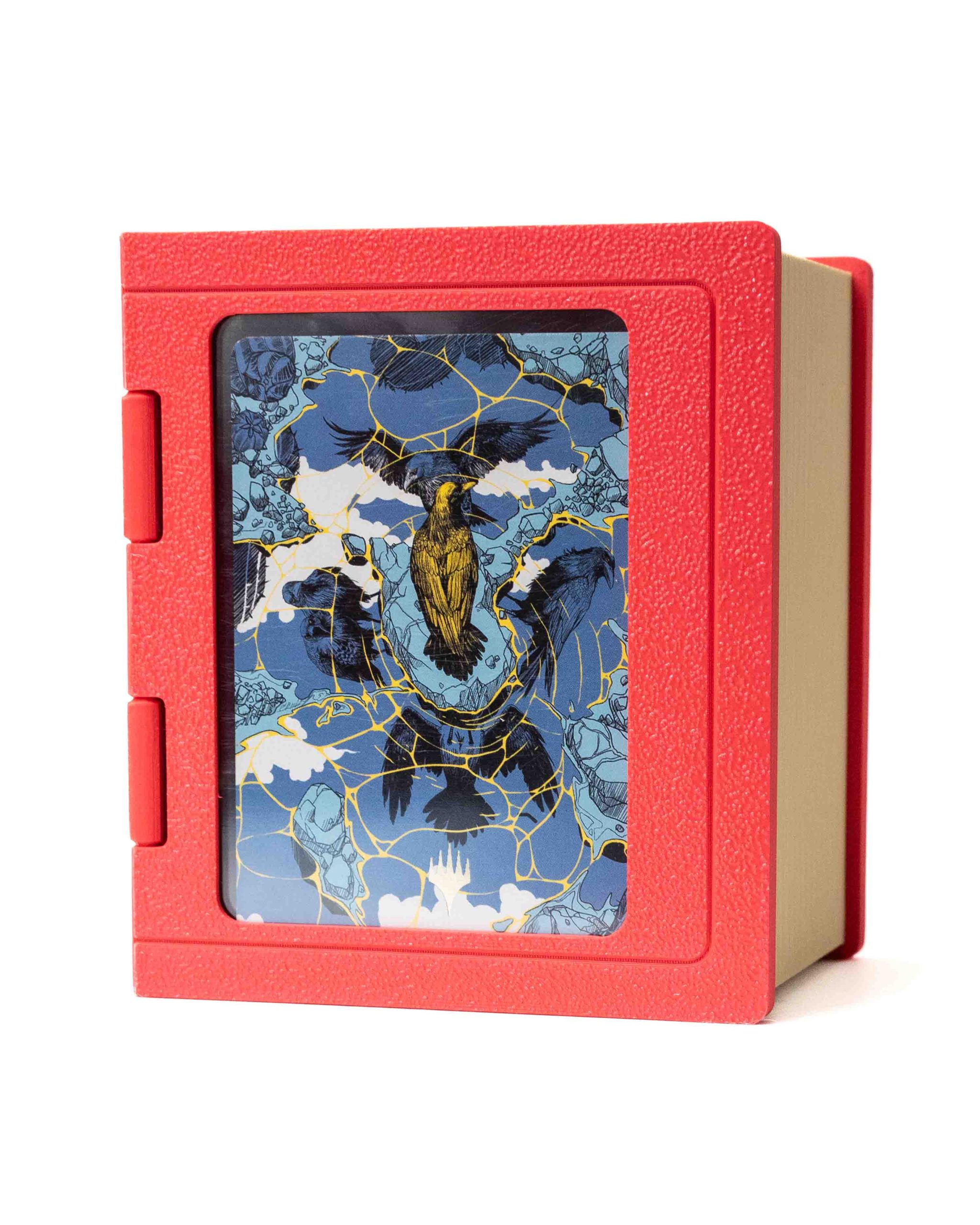 Cada caja está impresa en 3D con material PLA y luego pintada a mano, aplicando sombras, efectos envejecidos y detalles artísticos que le otorgan un aspecto realista de libro antiguo. Cuenta con una tapa que se despliega junto al lomo, facilitando el acceso a las cartas. Cuando está abierta, puedes usar el interior como cementerio durante la partida. Su cierre está reforzado con imames para evitar una apertura accidental y así garantizar la seguridad de tu mazo en todo momento. El resultado es una deckbox que parece sacada directamente de la biblioteca de un mago.